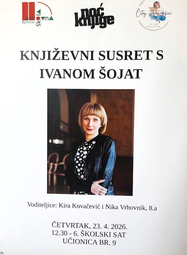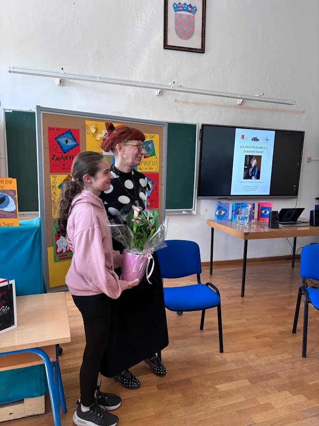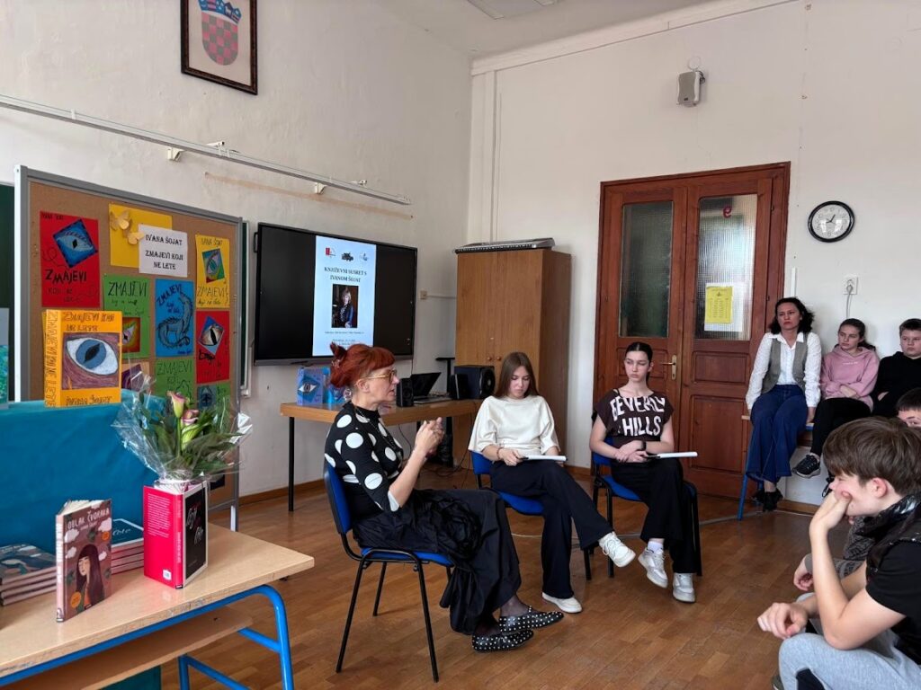 U četvrtak 23. travnja 2026. našu je školu posjetila književnica i prevoditeljica Ivana Šojat. Dočekali su je učenici 7. razreda i likovni radovi naših učenika za naslovnicu njezine knjige Zmajevi koji ne lete. Učenike je u književni susret uveo videomamac za već spomenuti roman.