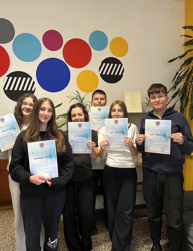 Pohvaljujemo sve učenike i učenice na njihovom odličnom znanju iz kemije, a posebno smo ponosni na izvrstan uspjeh učenice Dee Vidović i njezino osvojeno 1. mjesto u kategoriji 8. razreda. Čestitamo svim učenicima i njihovoj mentorici Heleni Juren!